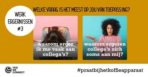 Elke maandag delen we een koffie-praat-plaat via social media. Deze maand 4 x eentje rondom het thema 'werkergernissen'. Volg Yes! We Connect op LinkedIn, zo mis je er geen één.